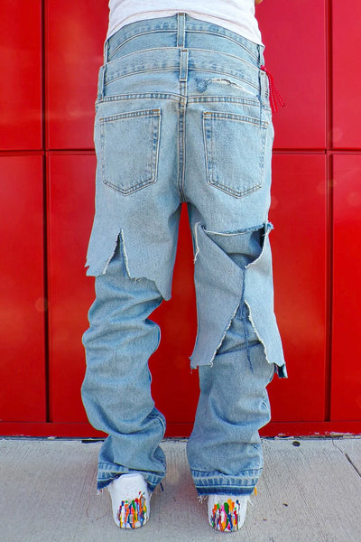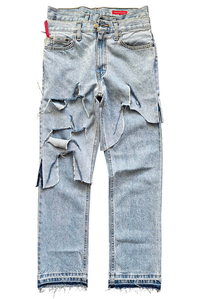 DISTRESSED LIGHT WASH DENIM OVERLAPPED ON STRAIGHT LEG LIGHT WASH DENIM